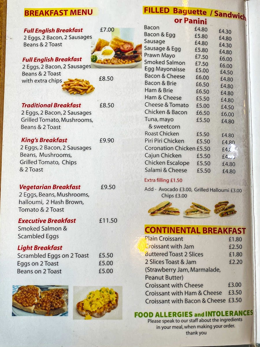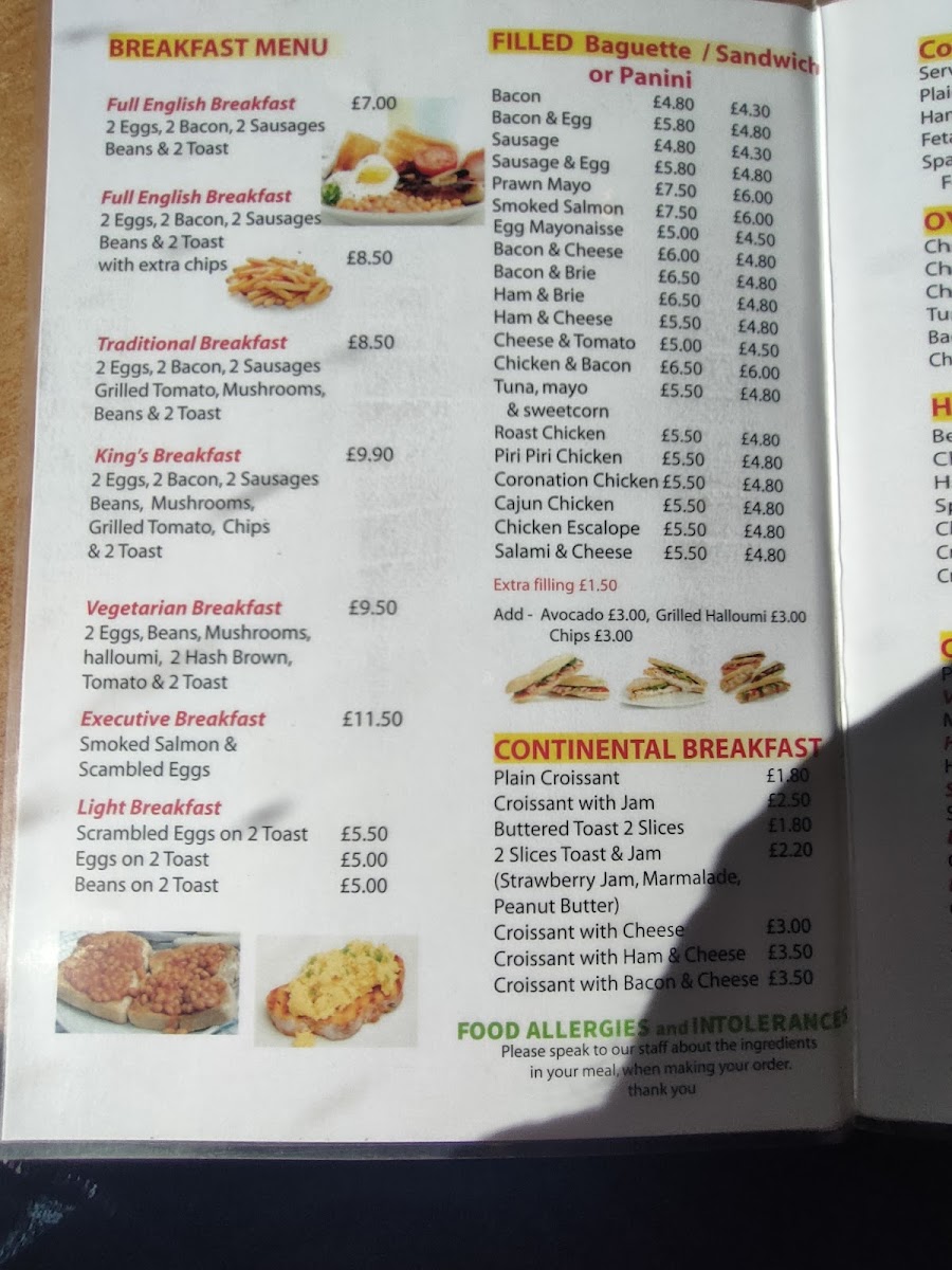 Morning visitors often enjoy hearty options like the Full English Breakfast with hashbrowns or scrambled eggs paired with smoked salmon, while those stopping by later might choose from a range of breakfast sandwiches and baguettes filled with bacon, sausage, or egg. Oven-baked jacket potatoes and freshly made paninis provide a wholesome, filling choice as the day goes on.